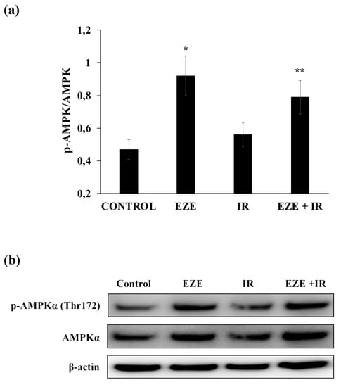 The Ezetimibe (EZE)-induced phosphorylation of AMPK in cardiomyocytes subjected to ischemia-reperfusion (IR). (a) The average quantification of the p-AMPK/AMPK ratio obtained by the densitometric analysis of three independent experiments. (b) Representative Western blot analyses for the indicated proteins. Data represent the mean ± SD of measurements performed in triplicate in three different experiments; * p < 0.01 vs. control; ** p < 0.01 vs. IR.