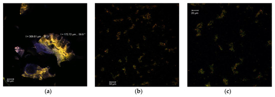 Figure 1. Confocal laser scanning microscopy images of MBC: native state MBC (a); fluorescently labelled MBC, magnification 0.6—707.3 µm × 707.3 µm, with pixel size of 0.60 µm (b); and fluorescently labelled MBC, magnification 1—424.4 µm × 424.4 µm with pixel size of 0.36 µm (c).