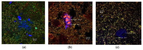 Due to the diversity of the ingredients used in the pastry cream recipe (milk, sugar, butter, wheat flour, etc.) that interact with each other, it is extremely difficult to identify each component separately by means of confocal laser scanning microscopy. Singh and Mishra [37] showed that monomeric anthocyanins display emissions in a wide range of wavelengths (550–650 nm), but the maximum emission was recorded at 585 nm (yellow to orange). Compared to the control pastry cream (Figure 2a), numerous yellow-orange microparticles could be observed in the samples with added MBC. These microparticles were aggregated into clusters of different sizes and dispersed more or less uniformly in the complex matrix of the product (Figure 2b,c). The microparticles appeared to be larger in the 10% MBC sample (Figure 2c). Also, the anthocyanins rich microencapsulated powder which contains bioactive compounds extracted from the eggplant peels also came with fibers from the fragments of plant tissue, which were frequently found in the product (Figure 2b). Thus, parenchymal cells with diameters between 42.31 and 54.59 μm can be observed, with intact cellulose walls (in blue) and an EPE anthocyanins rich cellular content (Figure 2b). In Figure 2c some large glycoprotein conglomerates (in blue), up to at 110.06 µm, were also present most likely from the pastry cream ingredients, milk, or flour.