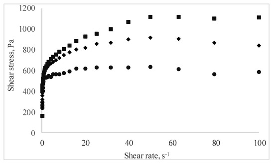 The rheological behavior of the pastry cream samples under flow conditions is presented in Figure 3 as shear stress vs. shear rate data. Regardless of MBC addition, all pastry cream samples displayed shear thinning behavior. The shear rate increased, and the apparent viscosity of the samples decreased over the entire tested shear rate. This behavior is the result of the changes occurring at increasing shear rates in the structure of the macromolecular compounds agglomerated in the samples, and it is in agreement with the results reported by Toker et al. [39] who investigated the effect of addition and interaction between different gums on the rheological properties of dairy desserts.