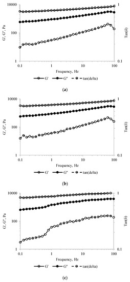 Figure 4. Storage modulus (G′), loss modulus (G″), and tan(δ) values of the pastry cream sample supplemented with different amounts of MBC: (a) Control—0% MBC, (b) 5% MBC, (c) 10% MBC.
