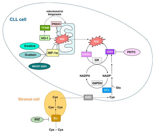 - Yosifov, D.Y.; Idler, I.; Bhattacharya, N.; Reichenzeller, M.; Close, V.; Ezerina, D.; Scheffold, A.; Jebaraj, B.M.C.; Kugler, S.; Bloehdorn, J.; et al. Oxidative stress as candidate therapeutic target to overcome microenvironmental protection of CLL. Leukemia 2020, 34, 115–127. [Google Scholar] [CrossRef]