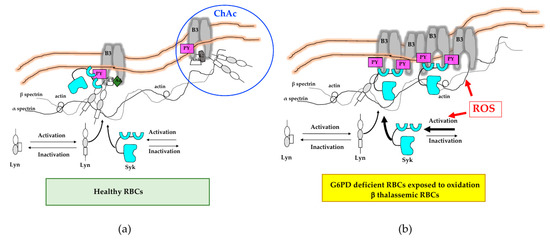 - Pantaleo, A.; Ferru, E.; Giribaldi, G.; Mannu, F.; Carta, F.; Matte, A.; de Franceschi, L.; Turrini, F. Oxidized and poorly glycosylated band 3 is selectively phosphorylated by Syk kinase to form large membrane clusters in normal and G6PD-deficient red blood cells. Biochem. J. 2009, 418, 359–367. [Google Scholar] [CrossRef] [PubMed]