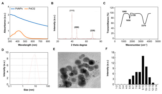 Synthesis and characterization of palladium nanoparticles (PdNPs) using resveratrol. (A) Ultraviolet-visible spectroscopy (UV-vis) absorption spectra of resveratrol-mediated synthesis of PdNPs (B). X-ray diffraction patterns of PdNPs (C). Fourier-transform infrared spectroscopy (FTIR) spectra of PdNPs (D). Size distribution analysis of PdNPs using dynamic light scattering (DLS) (E). Transmission electron microscopy (TEM) images of PdNPs (F). Histograms showing particle size distribution. All experiments were performed three times to obtain reproducible results. The data represent the results of a representative experiment.