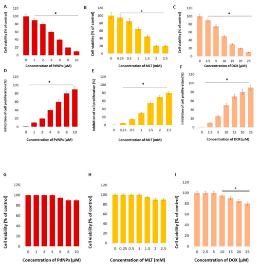 Effects of PdNPs, MLT, and DOX on cell viability and proliferation. Cell viability (A–C) and cell proliferation (D–F) of human adenocarcinoma cells (A549) exposed to different concentrations of PdNPs, MLT, or DOX for 24 h. Cells were treated with PdNPs at concentrations ranging from 1 to 10 µM, MLT at concentrations ranging from 0.25 to 2.5 mM, or DOX at concentrations ranging from 2.5 to 25 µM. Results are shown as the mean ± standard deviation of three independent experiments. The treated groups showed statistically significant differences from the control group per Student’s t-test. * p < 0.05 was considered significant. Cell viability (G–I) of human normal lung cells (L132) exposed to different concentrations of PdNPs, MLT, or DOX for 24 h. Cells were treated with PdNPs at concentrations ranging from 1 to 10 µM, MLT at concentrations ranging from 0.25 to 2.5 mM, or DOX at concentrations ranging from 2.5 to 25 µM. The treated groups showed no significant differences from the control group per Student’s t-test.