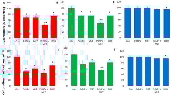 Effects PdNPs + MLT on cell viability and proliferation. Cell viability of A549 (A) H1229 (B) and L132 (C) cells and cell proliferation of human adenocarcinoma cells A549 (D), H1229 (E), and L132 (F) in each of the following treatments: control, 2.5 µM PdNPs, 0.75 mMMLT, 2.5 µM PdNPs combined with 0.75 mM MLT, and 5 µM DOX. Results are shown as the mean ± standard deviation of three independent experiments. The treated groups showed statistically significant differences from the control group per Student’s t-test. * p < 0.05 was considered significant; ** p < 0.01 was considered highly significant.