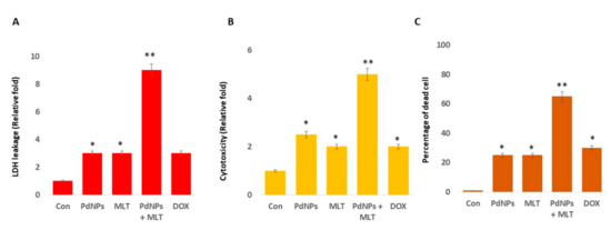 Effects of PdNPs + MLT in A549 cells. (A) LDH leakage, (B) cytotoxicity, and (C) percentage of dead cells in each of the following treatments: control, 2.5 µM PdNPs, 0.75 mM MLT, 2.5 µM PdNPs combined with 0.75 mM MLT, and 5 µM DOX. Results are shown as the mean ± standard deviation of three independent experiments. The treated groups showed statistically significant differences from the control group per Student’s t-test. * p < 0.05 was considered significant; ** p < 0.01 was considered highly significant.