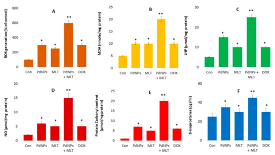 Oxidative stress seems to be one of the main mechanisms of cytotoxicity leading to cell death. To clarify the role of oxidative stress induced by PdNPs and MLT in A549 cells, we measured the oxidative stress markers as mentioned above. However, to evaluate the role of free radicals throughout the build-up of toxicity, more reliable markers were needed. 8-Isoprostane has been proposed as a reliable biomarker of oxidative stress, as it is produced by the oxidation of phospholipids in a given tissue [67]. In all treatments, 8-isoprostane levels showed a significant increase in comparison to untreated cells (Figure 6F). Exposure of A549 and HepG2 cells to AgNPs resulted in greater levels of malondialdehyde (MDA), 8-epi-PGF2α, 8-hydroxy-2′-deoxyguanosine (8-oxo-dG), heat shock protein A1A (HSPA1A), and heme oxygenase 1 (HO-1), indicating that metal nanoparticles such as AgNPs could potentially cause oxidative damage [68]. At the moment, studies addressing the effects of PdNPs + MLT on oxidative stress markers in A549 cells are lacking. Our results indicate that PdNPs + MLT could potentially induce oxidative stress and eventually increase the level of oxidative stress markers such as ROS, MDA, LHP, NO, protein carbonylation, and 8-isoprostane.