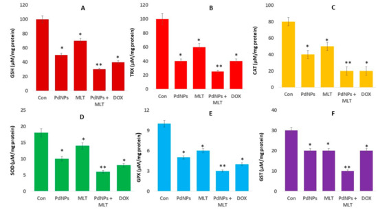 PdNPs and MLT show both pro-oxidant and antioxidant properties. However, their effects will depend not only on the concentrations used but also on the type of cells. Intracellular antioxidants such as glutathione (GSH), thioredoxin (TRX), superoxide dismutase (SOD), catalase (CAT), glutathione peroxidase (GPx) and glutathione-S-transferase protect cells against oxidative damage. Changes in the ratio of antioxidants to oxidants have a significant role in the pathogenesis of different cancer types [69]. Enzymatic antioxidants also play a critical role against oxidative stress. Thus, we evaluated the impact of PdNPs and MLT on several antioxidants; treated cells showed reduced levels of all the tested antioxidants, particularly cells treated with the combination of PdNPs and MLT (Figure 7). This result was consistent with the findings of Alarifi et al. [58], who reported that PdNPs significantly reduced the level of GSH in A375 cells.