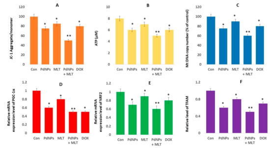 PdNPs + MLT causef mitochondria dysfunctions. Levels of (A) MMP and (B) intracellular ATP, (C) mitochondrial copy number, (D) expression level of PGC1α, € expression levels of NRF2, and (F) expression levels of TFAM. Results are shown as the mean ± standard deviation of three independent experiments. Student’s t-test revealed a significant difference between treated and control cells (* p < 0.05). * p < 0.05 was considered significant; ** p < 0.01 was considered highly significant.