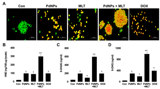 PdNPs + MLT induce apoptosis and oxidative DNA damage. (A) Morphological observation of cells under each treatment. Green staining indicated viable cells, whereas yellow-stained cells were early apoptotic and reddish- or orange-stained cells were late apoptotic. Each experiment was performed in triplicate (n = 3) and similar morphologic features were observed. Original magnification 200 μm. Levels of (B) HNE, (C) 8-Oxo-dG, and (D) 8-Oxo-G level. Results are shown as the mean ± standard deviation of three independent experiments. Student’s t-test revealed a significant difference between treated and untreated cells (* p < 0.05) and between the treated and control cells. * p < 0.05 was considered significant; ** p < 0.01 was considered highly significant.