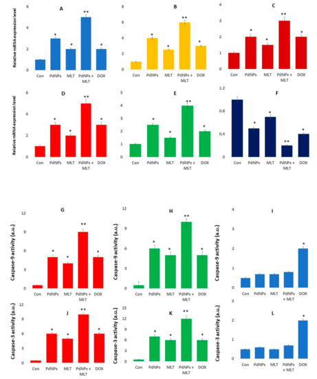 Total RNA was extracted from LNCaP cells treated with 2.5 µM of PdNPs, 0.75 mM of MLT, 2.5 µM of PdNPs combined with 0.75 mM of MLT, or 5 µM of DOX for 24 h using the PicoPure RNA isolation kit (Arcturus Bioscience, Mountain View, CA, USA). Samples were prepared according to the manufacturer’s instructions. Real-time RT-qPCR was conducted using a Vill7 device (Applied Biosystems, Foster City, CA, USA) and SYBR Green as the double-stranded DNA-specific fluorescent dye (Applied Biosystems). Target gene expression levels were normalized to the expression of glyceraldehyde-3-phosphate dehydrogenase (GAPDH), which was unaffected by treatments. The real-time qRT-PCR primer sets are shown in Table S1.