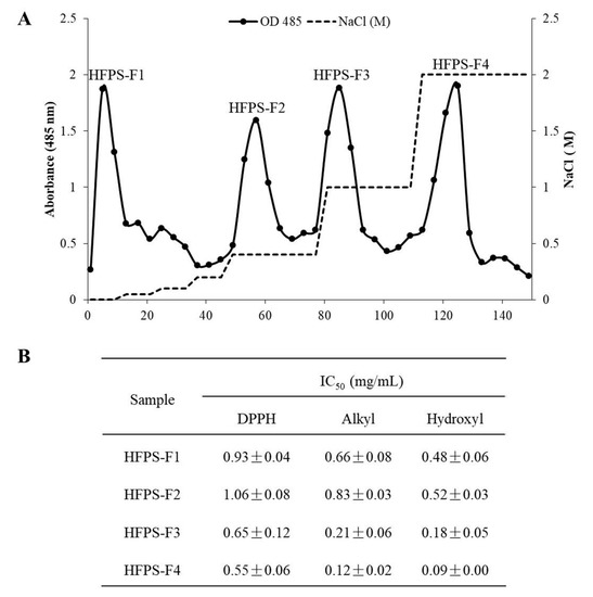 Isolation of polysaccharides from the crude sulfated polysaccharides of H. fusiforme (HFPS) and evaluation of their antioxidant activities. (A) The DEAE-cellulose chromatogram of the HFPS; (B) the free radical scavenging activities of polysaccharides isolated from HFPS. The experiments were conducted in triplicate, and the data are expressed as the mean ± standard error (SE).