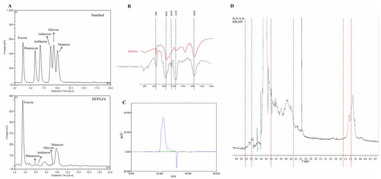 Chemical characterization of HFPS-F4. (A) High-performance anion-exchange chromatography (HPAE-PAD) spectrum of standard monosaccharide and HFPS-F4; (B) FT-IR spectra of HFPS-F4; (C) gel permeation chromatogram of HFPS-F4; (D) 1H NMR spectra of HFPS-F4.