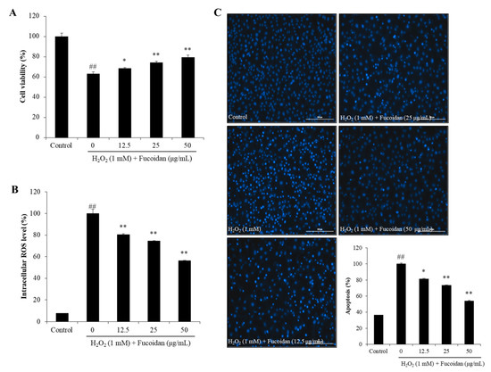 The effect of fucoidan on H2O2-induced oxidative stress in Vero cells. (A) The protective effect of fucoidan against H2O2-induced cell death in Vero cells; (B) the intracellular reactive oxygen species (ROS) scavenging effect of fucoidan in H2O2-stimulated Vero cells; (C) the protective effect of fucoidan against H2O2-induced apoptosis in Vero cells. The intracellular ROS level was determined by DCF-DA assay and the cell viability was evaluated by MTT assay. The apoptotic body formation was observed under a fluorescence microscope after Hoechst 33342 staining. Apoptosis levels were measured using Image J software. The experiments were conducted in triplicate, and the data are expressed as the mean ± SE. * p < 0.05, ** p < 0.01 as compared to the H2O2-treated group and ## p < 0.01 as compared to the control group.
