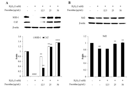 Nrf2 regulates the expression of antioxidant enzymes such as SOD-1 and CAT. Normally, Nrf2 is located in the cytosol and bound to a control protein that Kelch-like ECH-associated protein 1 (Keap1). In the oxidative stress condition, Nrf2 is released from Keap1, initiates translocation to the nucleus, and active the antioxidant genes to expression antioxidant enzymes [39]. As shown in Figure 4B, the total Nrf2 levels of H2O2-stimulated Vero cells was significantly decreased, whereas, increased in fucoidan-treated cells in a dose-dependent manner. This result demonstrates that the fucoidan increased the levels of SOD-1 and CAT by up-regulating total Nrf2 level.