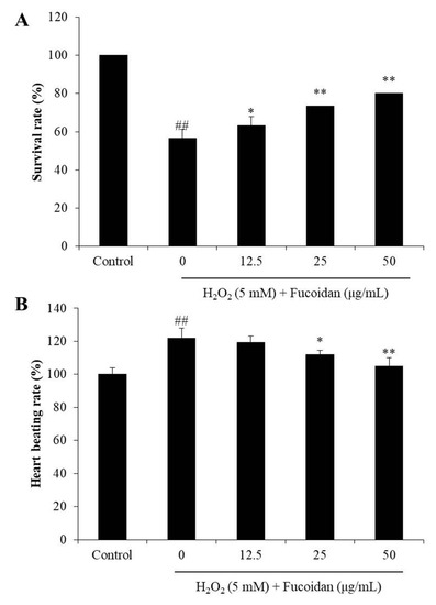 The effect of fucoidan on H2O2-induced alterations in survival rate and heart-beating rate of zebrafish. (A) The survival rate of zebrafish; (B) the heart-beating rate of zebrafish. The experiments were conducted in triplicate, and the data are expressed as the mean ± SE. * p < 0.05, ** p < 0.01 as compared to the H2O2-treated group and ## p < 0.01 as compared to the control group.