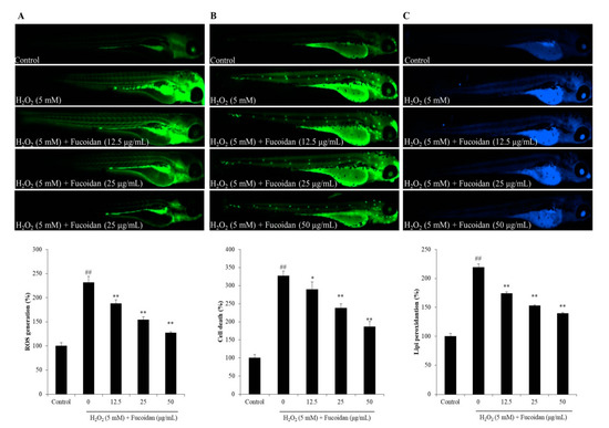 The effect of fucoidan on H2O2-induced ROS generation, cell death, and lipid peroxidation in zebrafish. (A) The protective effect of fucoidan against H2O2-induced ROS generation; (B) the protective effect of fucoidan against H2O2-induced cell death; (C) the protective effect of fucoidan against H2O2-induced lipid peroxidation. The relative fluorescence intensities of zebrafish were determined using Image J software. The experiments were conducted in triplicate, and the data are expressed as the mean ± SE. * p < 0.05, ** p < 0.01 as compared to the H2O2-treated group and ## p < 0.01 as compared to the control group.