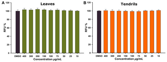 Cell morphology was assessed before and after the treatment with TE and LE by light microscope inspection. No morphological alterations in terms of spreading and cellular volume were noticed after the treatment with both extracts at all doses evaluated. The lack of toxicity was also supported by cell viability assessed using AB assay, with no sign of toxicity being observed in cells treated for 24 h with LE and TE at concentrations ranging from 10 to 400 µg/mL (Figure 1). In agreement with the current results, which indicated a high cytocompatibility of the extracts, Fraternale et al. reported that an aqueous extract from V. vinifera tendrils was not cytotoxic for human keratinocytes at a dose of up to 100 mg/mL [38]. Moreover, several other studies that evaluated the biological activities of aqueous or alcoholic extracts from different parts of V. vinifera indicated relatively low cytotoxicity on cultured cells, with the cancerous cell types displaying a higher sensitivity towards the cytotoxic effects of the extracts [41,42,43].
