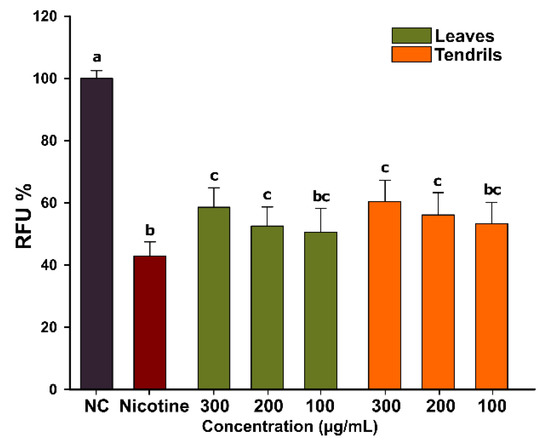 The cytoprotective effect of the TE and LE against nicotine toxicity was evaluated using AB assay described above. HGF cells were exposed for 24 h to a mixture of the extracts (LE and TE) at three concentrations, 100, 200, and 300 µg/mL, and 10 µM nicotine (IC50) followed by the incubation with a resazurin solution of 200 µM for 4 h. Three biological replicates including each 6 technical replicates were performed and included a negative control (cells exposed to culture medium containing 0.2% DMSO). The results were represented as relative values compared to the negative control (100%).