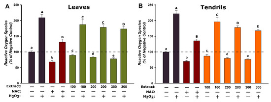 Antioxidant effect of the LE (A) and TE (B) evaluated using DCFH-DA assay on HGF cells. The cellular model was pre-exposed to LE and TE (100, 200, and 300 µg/mL) or NAC (20 mM) for 24 h, and further incubated with 50 µM DCFH-DA. The antioxidant effect was evaluated after 2 h on stimulated (250 µM H2O2) and un-stimulated conditions. The results are expressed as relative means ± standard deviations (six technical replicates for each of the three biological replicates) where the negative control (DMSO 0.2%) is 100%. Different letters (a–e refers to comparisons on non-stimulated conditions, whereas A–E refers to comparisons on stimulated conditions) represent significant differences (ANOVA + Holm-Sidak post hoc test at p < 0.05 level of significance).