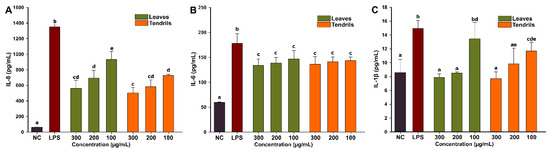The extracellular release of proinflammatory cytokines IL-8 (A), IL- 6 (B), and IL-1β (C) was analyzed in cell-free supernatants by ELISA at 24 h post-exposure to three concentrations of the LE and TE in combination with 100 ng/mL LPS. The values are expressed as mean ± standard deviation (SD) of four biological replicates. Different letters (a–e) represent the significant differences in mean quantities of cytokines measured (ANOVA + Holm-Sidak post hoc test at p < 0.05 level of significance).
