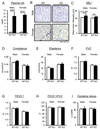 Plasma UA levels in mice are notably lower than in human because mice have uricase (Uox), an enzyme that oxidizes UA to allantoin [9]. To confirm the effect of higher UA levels on pulmonary function in normal mice, we analyzed the pulmonary phenotype of Uox-knockout (Uox-KO) mice, a genetic hyperuricemia murine model [28,36]. Plasma UA levels in male and female Uox-KO mice were 10–12 times higher than those in Uox-WT (WT) mice (Figure 1A). Uox-KO mice exhibited higher plasma blood urea nitrogen (BUN) levels, a typical renal dysfunctional phenotype observed in this model (Supplementary Figure S1A). Consistently, plasma antioxidant capacity was increased in accordance with UA increase (Supplementary Figure S1B). To examine the effect of UA alteration on lung morphological and functional changes, we observed airspace enlargement and the loss of alveolar walls in lungs and measured the alveolar mean linear intercept (MLI), the most common morphometric method to evaluate emphysema in animal models (Figure 1B,C). MLI in female Uox-KO mice was significantly increased, but within the normal range, compared with nondiseased female WT mice (WT group: 41.27 ± 0.649; Uox-KO group: 45.15 ± 1.292) (Figure 1C). Pulmonary function parameters commonly used in the clinic, such as resistance (R, a level of constriction), elastance (E, the elastic rigidity), compliance (C = 1/E, a static elastic recoil pressure at a given lung volume), forced vital capacity (FVC, an overall lung volume), forced expiratory volume in 0.1 seconds (FEV0.1, an inverse indicator of bronchoconstriction), and FEV0.1% (FEV0.1/FVC, an overall lung function), were analyzed by the flexiVent system, an invasive lung-function measurement system. No differences were observed in pulmonary mechanistic markers (R, E, C) or pulmonary functional markers (FVC, FEV0.1, FEV0.1%) in male and female Uox-KO mice compared with nondiseased C57/BL6J-background mice (Figure 1D–H). To investigate the association between high UA levels and oxidative stress in the blood, we performed d-ROMs test to quantify plasma oxidative damage molecules. Plasma oxidative stress was not affected by the Uox-KO condition (Figure 1I). Taken together, the data using nondiseased WT mice confirmed that alteration of plasma UA levels had no impact on physiological lung condition in either male or female mice.
