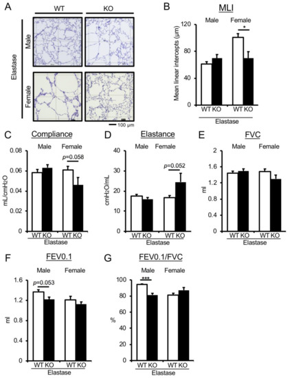 To verify the effect of UA on pathological lung function decline in mice, we utilized elastase-induced acute COPD models exhibiting pulmonary phenotypes, such as emphysema and lung dysfunction, with transient increases in the expression of inflammatory and senescence markers [27]. Uox-WT (WT) and Uox-KO mice were subjected to intratracheal treatment with elastase to induce acute COPD phenotypes. Importantly, the emphysematous phenotype in female, but not in male, elastase-treated Uox-KO mice was significantly suppressed compared with WT mice (Figure 2A,B). Consistent with this result, elastase-treated female, but not male, Uox-KO mice exhibited improvement in pulmonary mechanic parameters (compliance, p = 0.058, effect size d: 1.31; elastance, p = 0.052, effect size d: 1.35), as well as slight but not statistically significant improvement in pulmonary function parameters (FVC, p = 0.153, effect size d: 0.95; FEV0.1/FVC, p = 0.144, effect size d: 0.98) compared with elastase-treated WT mice (Figure 2C–G). On the other hand, the UA increase exerted a detrimental effect in elastase-treated male Uox-KO mice (Figure 2F–G). These results suggest the idea of a female-specific benefit of UA under pathological conditions in lung dysfunction.