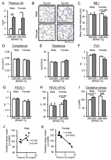 To further verify the ameliorative effect of UA on pathological lung function decline in female mice (Figure 2), we tested a chronic COPD mouse model, C57/BL6J-βENaC-Tg mice [26,27]. We administrated the uricase inhibitor potassium oxonate (oxo), a pharmacological inducer for hyperuricemia [37], to both male and female C57/BL6J-βENaC-Tg mice (Supplementary Figure S2A). The oxo treatment increased plasma UA levels by approximately 2–3 times (Figure 3A), as well as antioxidant activity (Supplementary Figure S2B). To evaluate the effect of increased blood UA on the emphysematous phenotype of C57/BL6J-βENaC-Tg mice, we measured the MLI. Oxo treatment tended to suppress the emphysematous phenotype in C57/BL6J-βENaC-Tg female mice (p = 0.08, effect size d: 0.83), while there was no significant difference between the oxo-treated and control groups in C57/BL6J-βENaC-Tg male mice (Figure 3B,C). Consistently, oxo-treated female but not male C57/BL6J-βENaC-Tg mice had greater effect size values in the improvement of pulmonary mechanic parameters (E, p = 0.257, effect size d: 0.61) (Figure 3D–E) as well as in the pulmonary function parameter FVC (p = 0.213, effect size d: 0.68). Importantly, oxo treatment tended to improve FEV0.1% in female but not in male C57/BL6J-βENaC-Tg mice (p = 0.061, effect size d: 1.02) (Figure 3F–H). Notably, plasma oxidative stress level was significantly decreased in female mice (p < 0.005, effect size d: 2.23) and tended to increase in male mice (p = 0.077, effect size d: 1.70) (Figure 3I). Consistently, a significant negative correlation was observed between plasma oxidative stress and UA levels in female mice (r = −0.959: p < 0.001) (Figure 3J), but no correlation was observed in male mice (r = 0.746: p = 0.054) (Figure 3K). Together, in vivo study using C57/BL6J-βENaC-Tg mice also demonstrated that increased plasma UA levels improved pathophysiological lung phenotypes of COPD mice in a female-specific manner.