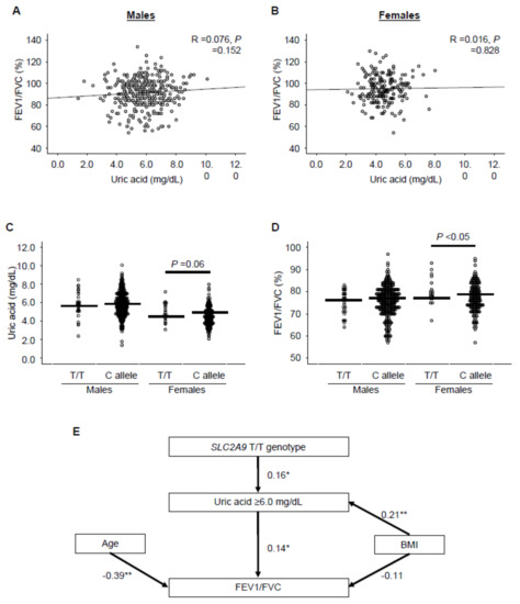 To verify whether the protective role of UA on lung dysfunction deduced from animals and in vitro experiments was also conserved in humans, we performed an exploratory epidemiological study in a total of 553 elderly subjects who were participants in a health screening program. In the present study, we used an aging-dependent decline of lung function as the respiratory dysfunction in humans, because lung aging is associated with the accumulation of oxidative stress, a condition of imbalance between ROS formation and cellular antioxidant capacity due to enhanced ROS generation and/or dysfunction of the antioxidant system, indicating that decreasing oxidative stress is crucial for lung homeostasis maintenance [2,3]. The clinical characteristics of the subjects in males and females are shown in Table 1. The parameters for respiratory function, i.e., FEV1/FVC, %FEV1, and %FVC, were significantly higher in female than in male subjects. The frequencies of the SLC2A9 rs11722228 C/C, C/T, and T/T genotypes were 50.3%, 41.6%, and 8.1%, respectively, and existed in a Hardy–Weinberg equilibrium (p > 0.05). The SLC2A9 genotype frequencies were not significantly different between male and female subjects (Table 1).