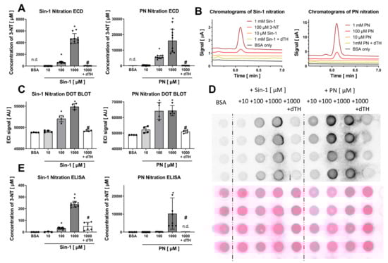 Coulometric detection of 3-NT yielded the most pronounced signal when an electrode potential of 800 mV was applied and allowed proper detection of 25 nM authentic 3-NT (Figure 1A,B). The calibration curve showed good linearity over a 3-NT standard concentration range between 10 and 500 nM (Figure 1C), which was still highly linear up to a concentration of 10 µM 3-NT. Purified BSA was nitrated using Sin-1 and PN and was afterwards digested using pronase. Digested samples were used for the detection by HPLC/ECD while parts of undigested samples were used for the detection by dot blot analysis or ELISA. Quantification of the free 3-NT signal from nitrated BSA showed a concentration-dependent increase with Sin-1 or PN, which was absent if nitrated samples were treated with the potent reductant dithionite (dTH) (Figure 2A,B). Dithionite is known to reduce 3-NT to 3-aminotyrosine. In untreated BSA, no 3-NT signal could be detected. Dot blot analysis using a specific 3-NT antibody showed a comparable pattern but a quite substantial background with untreated BSA samples or those nitrated and then treated with dTH (Figure 2C,D). In addition, there was plateau formation of the 3-NT signal in the presence of the middle and highest PN concentrations. The ELISA showed a nice concentration-nitration signal correlation but an unexpected signal pattern as well as large signal variation for the PN-treated BSA samples (Figure 2E). Overall, the HPLC/ECD method provided the best sensitivity for both nitrating agents, and for Sin-1, the best correlation between Sin-1 concentration and 3-NT yield as well as the most reliable effect of dTH reduction of 3-NT.