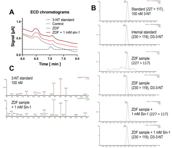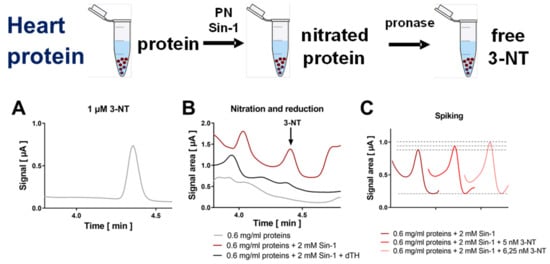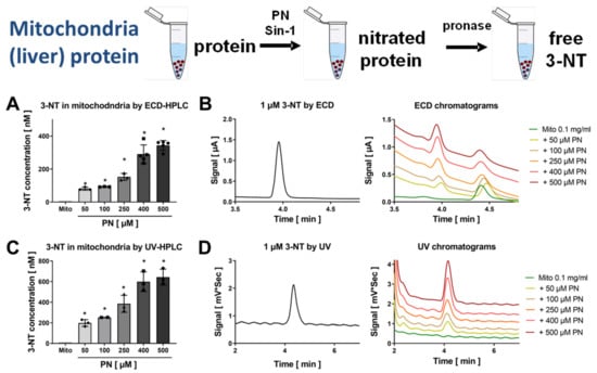 With the present study, we show that HPLC/ECD quantification is suitable for detection of free 3-NT from purified BSA and protein homogenates subjected to total hydrolysis by pronase after in vitro nitration by Sin-1 and PN. Concentration–response-curves of 3-NT standards were highly linear (detection limit 10 nM with 20 µL injection volume corresponding to 200 fmol). The presence of 3-NT in nitrated bovine serum albumin standards was validated by other methods (ELISA and dot blot analysis based on specific 3-NT antibodies). With our data, we also show that protein-bound 3-NT not only represents a footprint of PN formation and marker of oxidative stress but also correlates with increased mitochondrial superoxide formation rates, pointing towards self-propagating oxidative stress vicious circles and ROS-induced ROS formation as previously reported [37,38,41,42,43]. We also found 3-NT in samples of diseased (diabetic) animals using HPLC/ECD as well as LC-MS/MS measurement, however, with only marginal increase over 3-NT content in healthy control animals. Therefore, translation of our in vitro biological assay to the in vivo situation seems more sophisticated than expected.