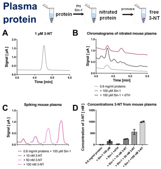 Detection of free 3-NT from nitrated plasma proteins by HPLC/ECD. Plasma was nitrated by Sin-1 and generated 3-NT was reduced by dTH. These samples were subjected to pronase digest before HPLC/ECD analysis. (A) Representative chromatogram of authentic 3-NT standard. (B) Representative chromatograms of Sin-1 treated plasma proteins after digest with or without dTH. (C) Spiking of potential 3-NT peak with low concentrations of authentic 3-NT standard to proof the identity of this peak. (D) Quantification of 3-NT yield of experiments shown in panels (B,C). HPLC/ECD analysis was performed with 20 µL of sample at 27 °C with isocratic elution (1.3 mL/min, mobile phase: 26.3 mM sodium citrate and 10.9 mM sodium at pH 4.75 with 3 v/v% methanol; 3-NT eluted at 4.76 min).