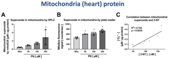Mitochondria were isolated from rat hearts and nitrated by PN at three increasing concentrations. Mitochondrial superoxide formation was measured by mitoSOX HPLC method or plate reader assay and showed a good correlation between PN concentration used for the nitration/oxidation of mitochondria and superoxide formation rate (Figure 7A,B). As the 3-NT yield from digested nitrated mitochondria was also determined for the same PN-treated samples, we were able to correlate the mitochondrial superoxide formation rate with the 3-NT concentrations. There was a good linear correlation between mitochondrial superoxide formation rate and the 3-NT concentrations in the same sample (Figure 7C), suggesting that oxidative damage of mitochondria (3-NT but probably also thiol oxidation) initiates mitochondrial superoxide formation, e.g., by pro-oxidative state of respiratory complexes. This would be in line with the previously suggested crosstalk concept among different ROS sources [37,38,39,40].