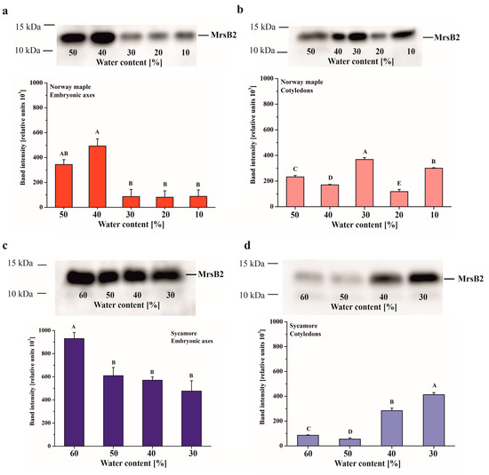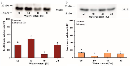 The MsrB2 protein was detected in seeds of both Acer species in embryonic axes as well as in cotyledons (Figure 4). The largest amount of this protein was revealed in Norway maple embryonic axes desiccated to 50% WC and especially 40%. Further desiccation (30–10% WC) caused a significant decrease in MsrB2 abundance, and this protein was barely detected (Figure 4A). The Norway maple cotyledons exhibited a different pattern since MsrB2 was detected at all desiccation stages, and the highest amounts were detected at 40%, 30% and 10% WC (Figure 4B).