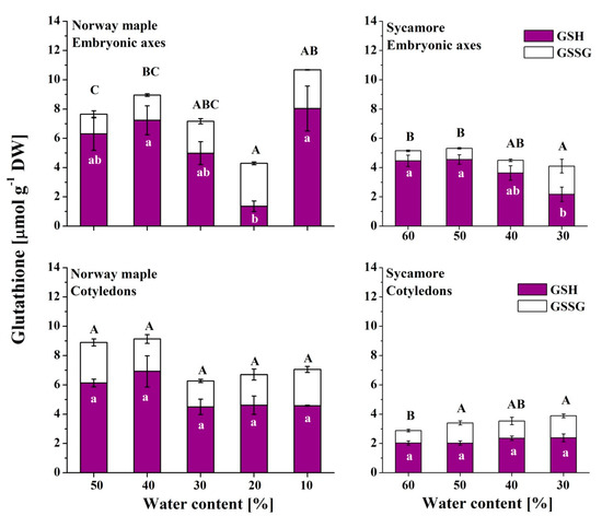 Levels of the reduced (GSH) and oxidized (GSSG) forms of glutathione measured in the embryonic axes and cotyledons of desiccated Norway maple and dehydrated sycamore seeds. The data are the means of three independent replicates ± the STDs. The same letters indicate groups that are not significantly different according to Tukey’s test. The capital letters refer to GSSG.