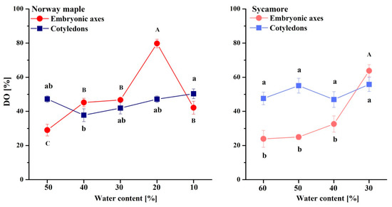 Analyzed Acer seeds differed in initial and final levels of hydration. Mature Norway maple and sycamore seeds displayed 50% and 60% WC, respectively. Seed drying was conducted in 10% intervals in both species to limits enabling their viability. More specifically, Norway maple seeds were desiccated up to 10% WC, whereas sycamore seeds were dehydrated up to 30% WC. Thus, the three dehydration stages, namely 50%, 40%, and 30% WC, were overlapping.