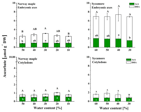 Levels of the reduced (AsA) and oxidized (DHA) forms of Asc reported in the embryonic axes and cotyledons of desiccated Norway maple and dehydrated sycamore seeds. The data are the means of three independent replicates ± the STDs. The same letters indicate groups that are not significantly different according to Tukey’s test. The capital letters refer to DHA.