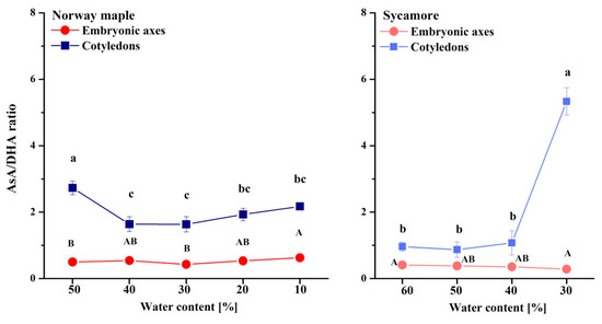 Ratios of reduced (AsA) to oxidized (DHA) forms of Asc in the embryonic axes and cotyledons of desiccated Norway maple and dehydrated sycamore seeds. The data are the means of three independent replicates ± the STDs. The same letters indicate groups that are not significantly different according to Tukey’s test. The capital letters refer to embryonic axes.