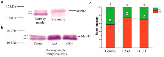 Characterization of the redox state of the MsrB2 protein. (a) Immunoblot analyses of MsrB2 proteins in two Acer species. Two bands corresponding to two redox states are visible only in Norway maple. (b) Immunoblot analyses of MsrB2 proteins using non-treated Norway maple protein extract (control) and protein extract incubated in vitro with the reducing reagents, ascorbic acid (AsA, lane 2) or GSH (lane 3). (c) Densitometric analysis of the oxidized and reduced forms of MsrB2. The data are the means of three independent replicates ± the STDs. The same letters indicate groups that are not significantly different according to Tukey’s test.