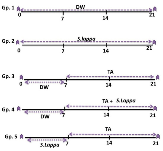 - Gp. 4 (co-treated): Each rat was orally administered distilled water (1 mL/rat) for one week, then concurrently treated with TA and S. lappa extract for two weeks by the same previous doses and routes.