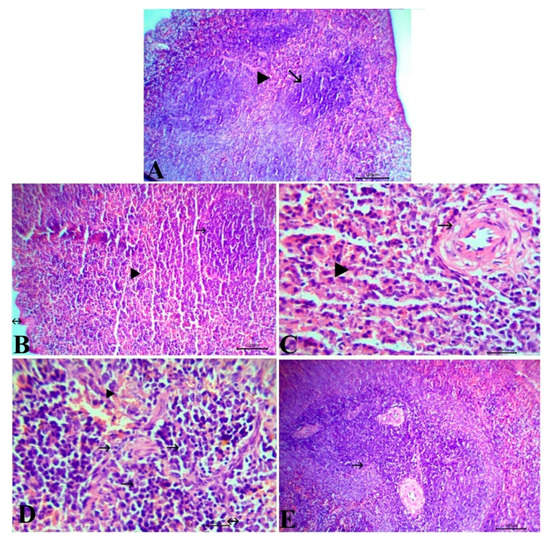 The control and S. lappa-treated groups revealed normal splenic tissue, including fibrous capsules from which trabeculae enter into the parenchyma-containing central arterioles in the center of white pulp surrounded with red pulp (Figure 6A,B). On the other hand, TA-injected rats showed thickening, vacuolation, and endotheliosis in the wall of the center arterioles. In addition, necrosis and depletion of lymphocytes inside the white pulp and reduction of the size of the lymphoid follicles in addition to congestion of the red pulp were observed (Figure 6C). The co-treated group exhibited mild hyperplasia of lymphocytes inside white pulp and a few infiltrations of mononuclear cells with congestion of the red pulp (Figure 6D). The rats that received S. lappa as protection in the prophylactic group showed hyperplasia of lymphocytes inside the white pulp (Figure 6E). All the detected lesions in the lung and spleen tissues of all experimental groups were scored and are displayed in Table 4.