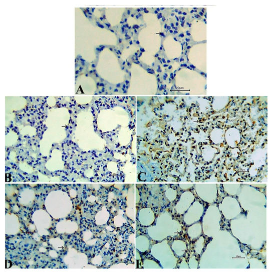 Spleen and lung specimens were prepared for immunohistochemistry using the avidin-biotin- peroxidase (ABC) method [49]. To deactivate endogenous peroxidases, the sections were exposed to 3% hydrogen peroxide for 10 min after deparaffinization. The deparaffinized sections were heated in 10 mM citrate buffer at 121 °C for 30 min then blocked in 5% goat serum for 20 min. After that, they were incubated with a primary monoclonal antibody specific for spleen CD8+ and lung Caspase 3 (MCA1768, Serotec, Kidlington, UK) (AB-20074b, Sangon Biotech, Shanghai, China), respectively, overnight at 4 °C. Sections were incubated with a biotin-conjugated secondary antibody (1:2000 in phosphate buffer saline (PBS); Cat. No. sc-2040) for 20 min at 32 °C after three washes with PBS, then incubated with horseradish peroxidase (HRP)-labelled streptavidin. The antibody binding was determined using a substrate/chromogen (diaminobenzidine) reagent and Mayer’s hematoxylin. The cellular reaction appeared as brown granules inside the nucleus of epithelial cells, the staining intensity of the samples was evaluated as mild, moderate, or strong and scored by calculating the positive cells/image percentage by a 5-point scale as follows: + = < 10% (negative to weak expression), ++ = 10%–25% (mild expression), +++ = 26%–50% (moderate expression), ++++ = 51%–75% (strong expression).