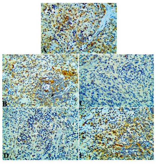 Caspase-3 immunoexpression, a marker for caspase-dependent apoptosis, was evaluated to investigate the underlying mechanism of TA on endothelial cells. The activity of the Caspase-3 enzyme in the lung tissue was augmented by TA administration, as observed in Figure 6C that was manifested by strong immunoreactivity compared to the rats in both control and S. lappa-alone-treated groups, which revealed an adverse reaction of this enzyme (Figure 7A,B). The Caspase-3 protein expression was reduced by S. lappa treatment of TA-injected rats, but not completely normalize (Figure 7D,E). CD8+ as a marker of activated T lymphocytes exhibited negative to weak expression in the splenic tissues of TA-only-treated rats Figure 8C, and strong positive expression in both healthy control and plant-alone-administered animals (Figure 8A,B). The number of CD8+ immune-positive cells was enhanced in the TA-exposed groups treated with S. lappa varying from a mild to moderate degree in both co-treated and prophylactic groups, respectively, (Figure 8D,E). The scores are summarized in Table 4.