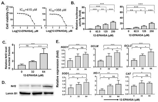 Evaluation of the antioxidant potential of eicosapentaenoic (EPA)-derived FAHFAs in C3A cells. (A) Cell viabilities (IC50) of 12-EPAHSA and 12-EPAHOA (B) Reporter gene assay results of 12-EPAHSA and 12-EPAHOA (C) Relative nuclear Nrf2 protein expression induced by 12-EPAHSA (D) Protein levels of Nrf2 by Western blot analysis after treated with 12-EPAHSA. (E) Relative expression of antioxidant enzymes in response to 12-EPAHSA treatment. * p < 0.05, ** p < 0.01, *** p < 0.001, ns: not significant (one-way ANOVA) (n = 6). (NQO1: NAD(P)H quinone oxidoreductase 1, HO1: heme oxygenase-1, GCLM: glutamate–cysteine ligase modulatory subunit, GCLC: glutamate–cysteine ligase catalytic subunit, CAT: catalase, and SOD1: superoxide dismutase 1).
