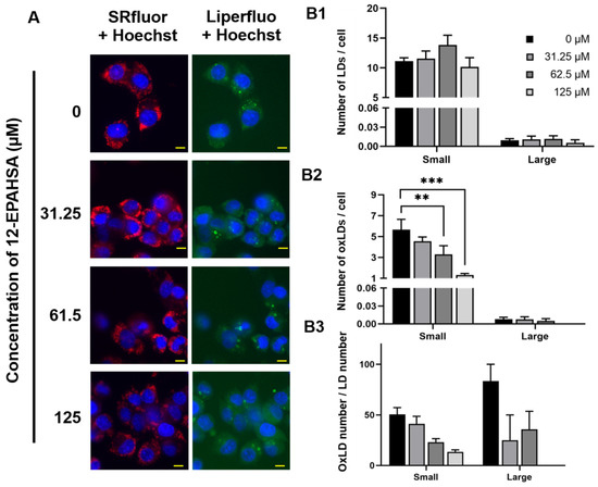 Fluorescent imaging of lipid droplet (LD) and oxidized lipid droplet (oxLD) was performed according to a previously established method in our laboratory [18]. Briefly, the cells were precultured in 0.1% gelatin-coated glass bottom dish with 6 × 105 cells in 3 mL of the medium for 24 h. Then, the cells were treated with 400 µM linoleic acid (LA) with 0–125 µM 12-EPAHSA. After 8 h incubation, the cells were stained using 5 µM SRfluor 680-phenyl (Funakoshi co. Ltd., Tokyo, Japan) a fluorescent probe for neutral lipids, 10 µM Liperfluo, and 10 µg/mL Hoechst33342 (Dojindo laboratories, Kumamoto, Japan) a probe for lipid peroxides and nuclei, for 30 min at 37 °C. Fluorescence was recorded using the BZ-9000 Keyence fluorescence microscope having filter sets; excitation: 360/40 nm, emission: 460/50 nm, dichroic mirror: 400 nm (blue); excitation: 470/40 nm, emission: 525/50 nm, dichroic mirror: 495 nm (green); excitation: 620/60 nm, emission: 700/75 nm, dichroic mirror: 660 nm (red). Acquired images were processed by ImageJ 1.50i software. The intersectional images were obtained from binarized images of bright field, SRfluor and Liperfluo in the same visual field. Statistical analyses were performed using the GraphPad Prism 6 software. Data derived from three or more replicates are shown as mean values ± SEM. Student’s t-test (two-tailed) was used to study statistically significant differences between the groups and a p-value of <0.05 was considered as statistically significant.
