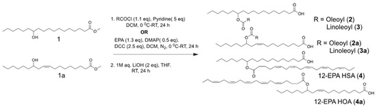To a solution of 12-HSA-OMe or 12-hydroxyoleic acid methyl ester (12-HOA-OMe) (200 mg, 0.63 mmol) in dry dichloromethane (15 mL), DMAP (38.7 mg, 0.5 eq) and DCC (327.5 mg, 2.5 eq) at 0 °C under nitrogen atmosphere, EPA (264.7 µL,1.3 eq) was added slowly and stirred for 24 h at room temperature under nitrogen atmosphere. The reaction mixture was extracted with dichloromethane by successive washing with 0.5M HCl, saturated NaHCO3, NaCl and dried over sodium sulfate. The crude extract was concentrated under reduced pressure and the resulting mixture was purified with flash column chromatography (hexane/ethyl acetate = 98/2~90/10) to give methyl esters of 12-EPAHSA, and 12-EPAHOA with a yield of about 60–65%. Further, their methyl esters were subjected to alkali hydrolysis as described above and the reaction was neutralized with 2N HCl under an ice bath, followed by extraction with ethyl acetate, concentrated in vacuum and purified via silica gel column chromatography (hexane/ethyl acetate/AcOH = 95/5/0~80/20/1) to give 12-EPAHSA (4) and 12-EPAHOA (4a), FAHFAs with a yield ranging between 70% and 75%.
