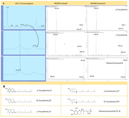 (A): Separation (by HPLC, left) and identification (by liquid chromatography coupled to electrospray ionization mass spectrometry in tandem [LC-ESI-MS/MS], center and right) of tocochromanols in Bacon avocados. (B): Chemical formula of tocochromanols identified in Bacon avocados.