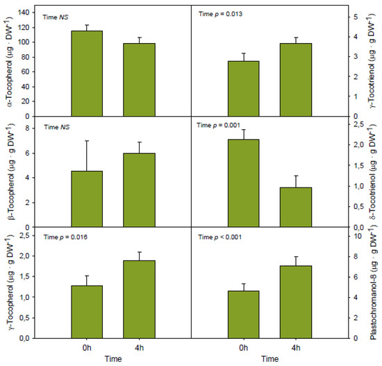 Influence of short-term (4 h) exposure of Bacon avocados to cold temperatures (4 °C) in the contents of tocochromanols. Data represent the mean ± SE of n = 18 fruits. Differences were considered significant when p < 0.05. DW, dry weight.