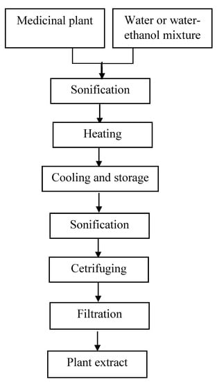 Extraction was carried out using water and 50% (v/v) ethanol in water. Extracts from medicinal plants were prepared according to the method of Bucić-Kojić et al. [31], with some modifications. The extracts were prepared as follows: 2 grams of ground plant material were mixed with 100 mL of distilled water (water extracts) or 100 mL of a mixture (1:1) of distilled water and ethyl alcohol (water-ethanolic extracts) with the addition of 0.1% NaHSO3. The obtained mixture was sonicated in an ultrasonic shaker (UM-2, Unitra-Unima Olsztyn, Poland) for 15 min and heated at 80 °C for 5 min. Afterwards, the mixture was cooled down to room temperature and stored at 4 °C for 12 h. Next, the mixtures were re-sonicated and centrifuged at 5000 rpm (MPW-351R, Mpw Med. Instruments, Poland) for 10 min (Figure 1). Finally, extracts were used for analyses of phenolic compounds and antioxidant activity (AA).
